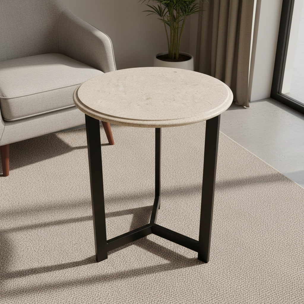 Round Fossil Onyx Marble Accent Table with Minimalist Black Metal Base