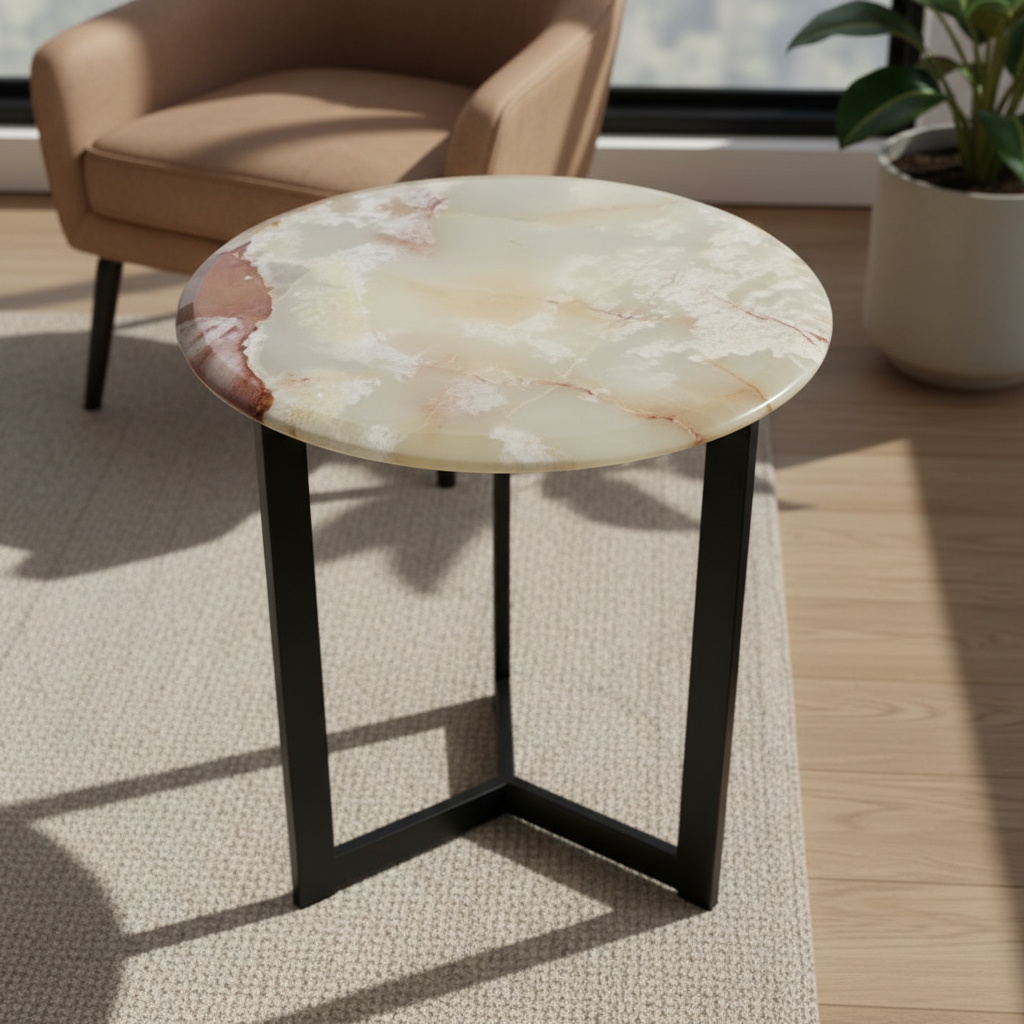 Soft green tones ripple across the marble, evoking freshness and tranquility. Perfect for adding a subtle touch of color and calm to any space. A luxurious accent piece designed to capture attention and infuse your space with tranquil elegance. The tabletop is crafted from genuine, translucent light green onyx, featuring beautiful swirls of white and warm gold veining that create a rich, natural work of art. This exquisite top is perfectly complemented by a durable, geometric black metal base, making it an ideal, high-end side table for your living room, bedroom, or entryway.